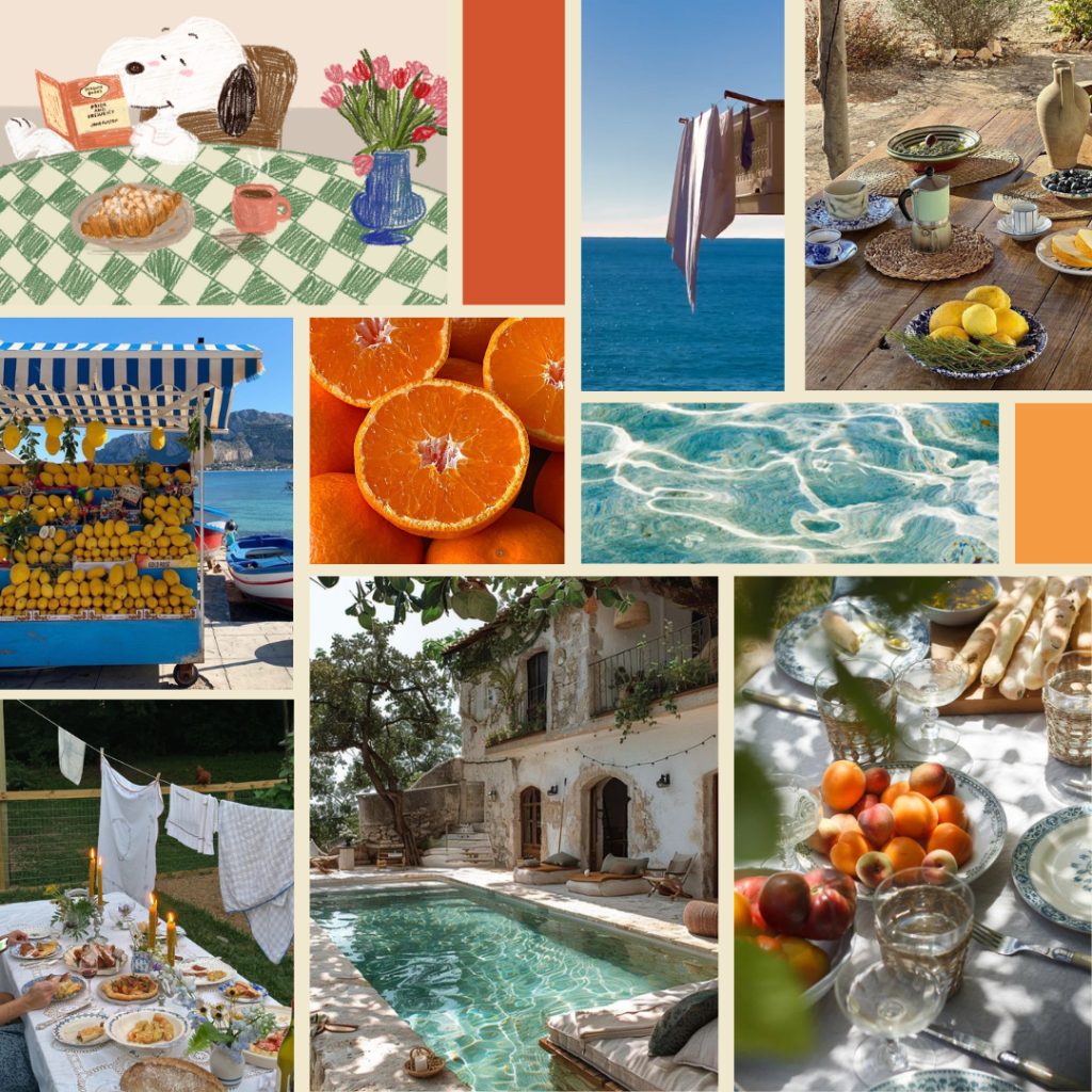 - le bleu de la mer, l’orange des fruits juteux et le jaune du soleil